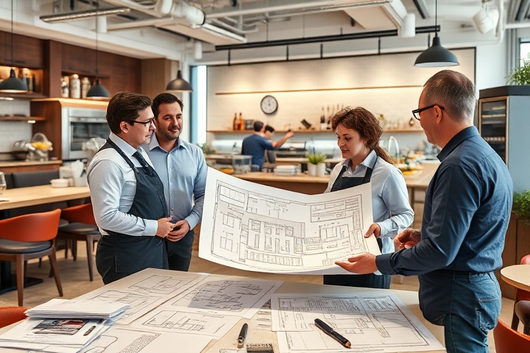 お客様の要望をヒアリングし、建築屋さんや内装屋さんとの打ち合わせをサポート。厨房と客席のバランスを考えた区画分けや動線を考慮した厨房レイアウトを提案します。